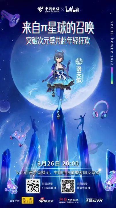 9月26日20:00 请关注Bilibili官方直播间 中国电信星播客 新浪、网易、搜狐、天翼云VR 等各大平台直播间 洛天依与你不见不散! |