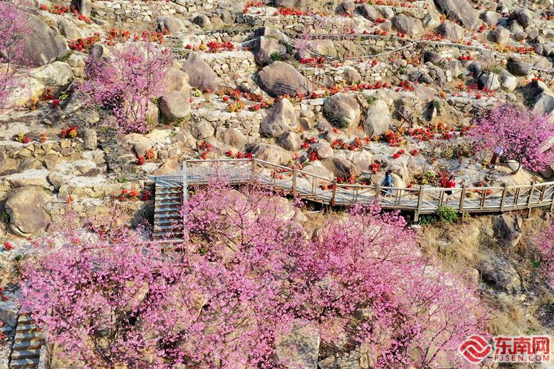 樱花盛开在石岩之中(航拍) 黄曦摄 由于今年开春天气较暖,不少地方的桃花和樱花提前开放,目前台林农场的水蜜桃和八重樱正逢花期末尾,花团锦簇间春意盎然,还有少部分吉野樱仅仅冒出花蕾,再过10天将迎来春季最后一抹粉色。农场负责人林文献是台湾人,22年前跟随父亲来到漳州港创业,为了一解思乡之情,他漂洋过海将阿里山樱花带到这里扎根,如今除了樱花,农场里还有凤梨、黄金木瓜、释迦等上百种台湾珍稀水果,站在高处放眼望去,宛如一座小小的“花果山”。 |