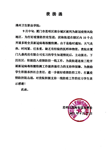 金秋九月原本是收获的季节,福建疫情却牵动人心。随着疫情防控不断升级,在医疗资源紧缺、医疗压力较大、本省疫情防控任务较重的情况下,漳州卫生职业学院各地实习生闻令而动,积极报名,主动投身防疫一线。 闻令而动 投身抗疫一线 少年强,则国强。青年人在攻坚战中表现出来的责任、担当、勇敢是这个时代的底色,也是我们抗击疫情的底气。新冠疫情扑面而来,厦门九鼎药房有限公司药学系实习生王坤森、黄翠糯、杨智慧、池艺萍等同学喊出:“我在!” “我来!”,主动报名参加厦门市思明区滨海街道办事处组织的核酸采样工作,并获得高度肯定。这只是所有抗疫青年的缩影,学院学子们像希望的蒲公英,带着学校的寄托,带着青年人的担当,带着医学生的使命,在祖国最需要的地方茁壮茂盛。