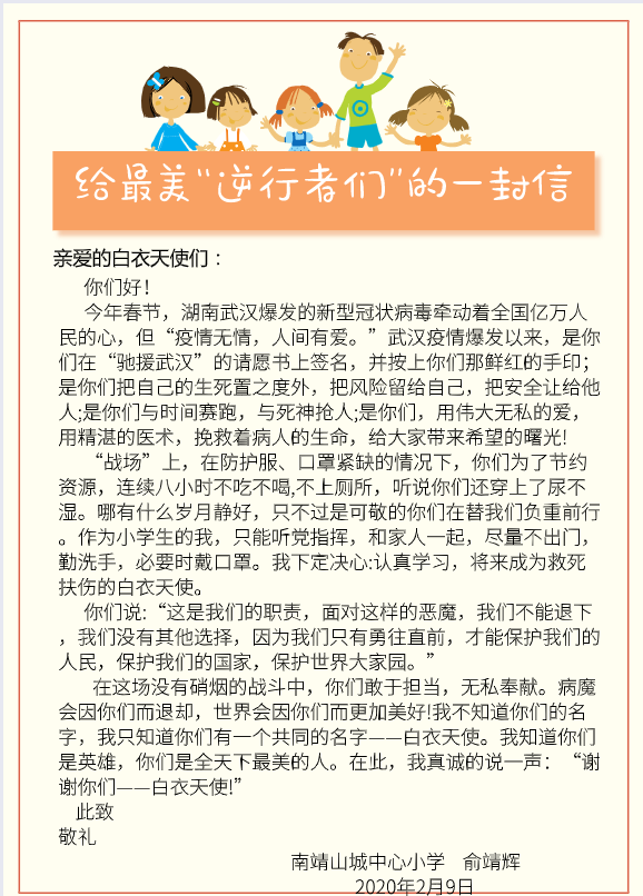 小朋友们通过制作手抄报、视频给大家科普防疫的小知识;通过向最美“逆行者们”写信向在一线工作的白衣天使表达感谢。目前,南靖县山城中心小学已收集少先队员创作手抄报、书信等作品200余篇,录制祝福寄语视频20余个。孩子们通过此次宣传活动,与家人一起学习了防疫知识,积极做好个人防控,用自己的实际行动为武汉加油,为中国加油,为疫情防控贡献自己的力量。