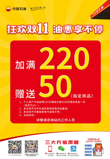 优惠二:满220元送50元 “双十一”即将来临,笔者从中石油漳州分公司获悉,该公司推出了多重优惠叠加活动,在中国石油漳州地区指定加油站,个人用户汽油加满220元赠送价值50元指定商品一份(数量有限,先到先得,送完为止)。