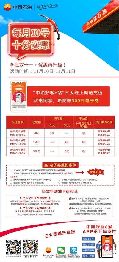 优惠一:10惠+双十一,最高赠300 据介绍,此外,活动期间,还有超级“10惠日”、“双十一”活动。11月10日至11日,通过“中油好客e站”APP、“中油好客e站”微信公众号或“中油好客e站”支付宝生活号充值,即可获得非油满减券及汽油劵,可在便利店购买指定商品或消费汽油获得满减优惠,最高赠送300,为大家带来实实在在的“实惠”。