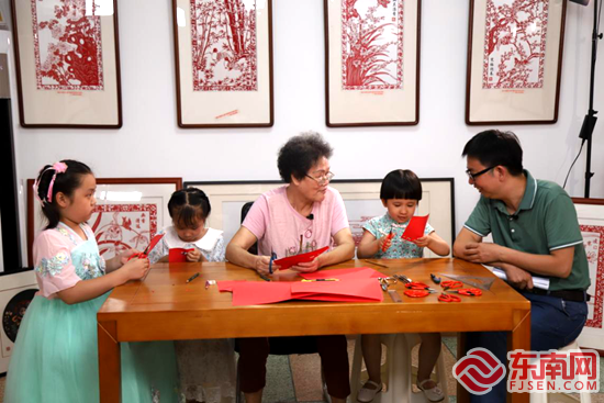 陈秋日老师正在进行剪纸入门教学 剪纸入门的教学拍摄加入了三位小朋友。几个小朋友最大的也才上小学不久,正是爱玩好动的年龄,在工作台前没坐一会儿便走起了神,对着摄像机做起了鬼脸。陈秋日老师面对这样闹腾的孩子经验十足,拿出几张纸,带领大家画上自己喜欢的图案,并用孩子们能理解的语言耐心讲解几种基本纹样的剪法。大家迫不及待地拿起剪刀,刚还十分热闹的现场一下子安静了下来。 非遗保护不只是技艺的传承,更是和当下生活的结合。这次的拍摄中,陈秋日老师的徒弟黄丽蓉和陈燕榕分别带上了自己的作品前来请教。黄丽蓉以建党100周年为主题创作了一幅作品,却总感觉有不到位的地方,“增加一些排剪,然后用套色来增强视觉对比怎么样?”陈秋日老师一边端详着画面一边提出建议,令黄丽蓉大受启发。陈燕榕则是向陈秋日老师请教了自己关于漳浦剪纸未来的发展和创新的困惑,非遗的传承要“见人见物见生活”,漳浦剪纸也尝试着融入日常之中,水杯、摆件、装饰画,漳浦剪纸尝试着和现代生活接轨,看着这些漳浦剪纸作品为主题的文创产品,陈秋日老师的脸上露出了欣慰的笑容,并嘱咐到:要有经济效益的意识,剪纸的传承才不会只是一句空话。