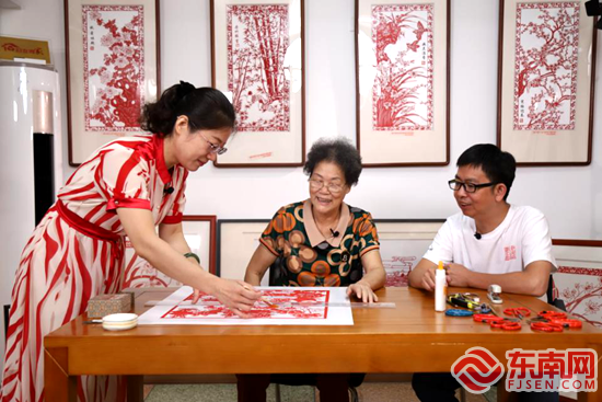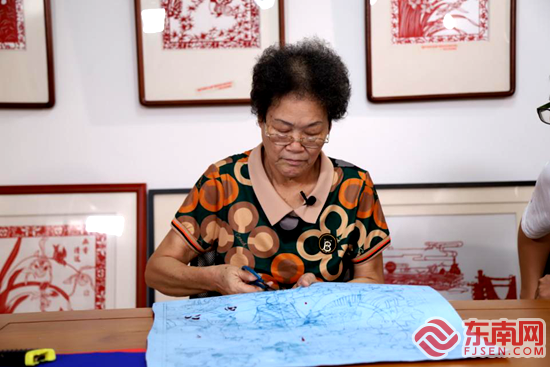 陈燕榕在陈秋日老师的指导下进行《乡情》的装裱 《乡情》这幅作品中多处用到了“排剪”的剪纸技巧,这是陈秋日老师的拿手绝活。“排剪”是指在一定的范围内剪出成排的细如毫发、毛边的形状,这项技法十分考验眼力和精力,年过七旬的陈秋日握住剪刀的手却依然沉稳而灵活,她专注于剪刀与画面的每一次接触,拍摄现场安静得针落有声,四个机位的摄像机记录下每个细节,陈建新也笑称:“难得见到陈老师展现绝活,都看入迷了。”剪好后的作品经过装裱、盖上印章然后放入相框,一幅完整的剪纸作品就这样在从一把剪刀一张纸中诞生。 陈秋日深知,漳浦剪纸的传承不能只靠她一个人,把剪刀传递下去才是让漳浦剪纸永续生命力的关键,因此她在剪纸的传承也上下了不少功夫,这次的国家非遗抢救性记录的传承教学拍摄也记录下陈秋日老师在剪纸教学方面的独特经验。