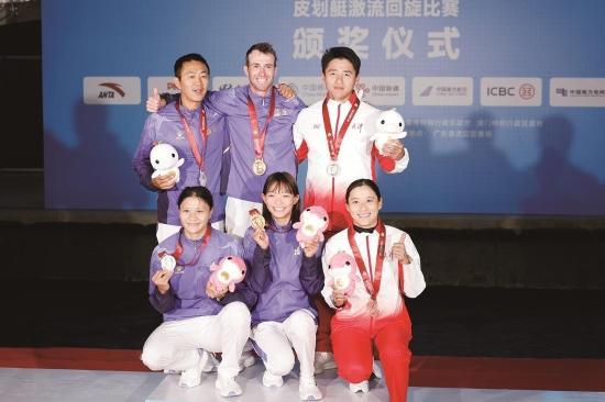 ▲11月13日,李诗婷(前中)与亚军、季军选手在颁奖仪式上和教练合影。 新华社记者 黄伟 摄