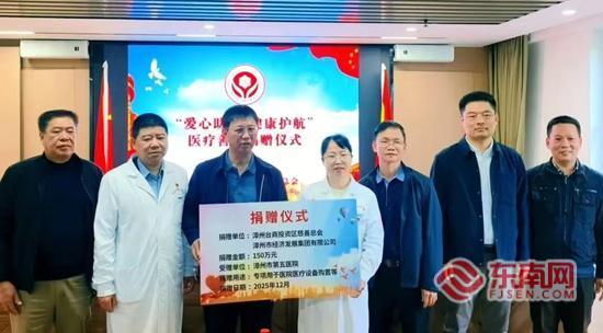 东南网漳州12月25日讯(通讯员 戴莉莉 文/图)12月24日上午,漳州台商投资区举行“爱心助医·健康护航”医疗善款捐赠仪式。台商投资区卫健与疾控中心、慈善总会、经发集团、城市运营集团、资产运营集团、产业集团共同向漳州市第五医院颁发“150万元医疗设备购置款”的捐赠牌,助力台商投资区医疗服务水平再上新台阶。 漳州市第五医院院长周雪丽在致辞中对台商区各部门的善举表达了感谢。她说,此次捐赠是推动医院医疗升级的“助推器”,通过硬件赋能,为后续技术提升和服务优化奠定了基础。医院在接收捐赠后,还将进一步强化技术培训、优化服务流程,推动诊疗能力跃升,让台商区及周边百姓享受更优质高效的医疗服务。