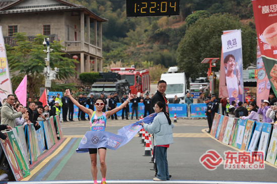 男子组冠军廖顺虎冲线瞬间 经过激烈的角逐,廖顺虎以1小时08分07秒勇夺男子组冠军,范春香以1小时22分02秒摘得女子组桂冠;颜松斌获漳州籍男子组冠军,郑秀燕获漳州籍女子组冠军。