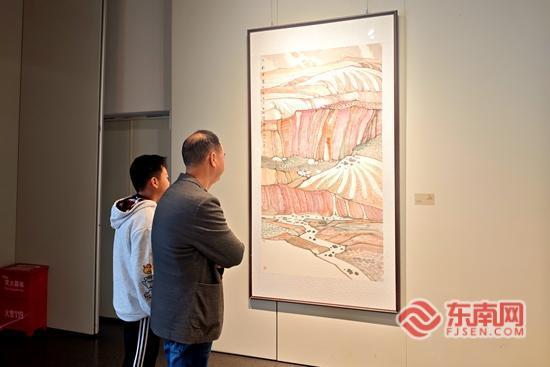 游客沉浸式观展 作为福建省文联选派的第九批援疆干部人才,张秋桔在为期一年半的援疆期间,深入贯彻新时代党的治疆方略,坚持以文化人、以艺通心,足迹遍布天山南北。他带领当地美术工作者深入戈壁绿洲、草原雪山,在行走与感悟中,以水墨丹青生动绘就新疆的壮丽山川与人文风貌。“当时我去援疆后,当地人都认为新疆的山水适合用油画呈现,我并不认同。我认为新疆山水也可以用中国传统笔墨形式去表现,经过多次尝试,我们成功用水墨画的面貌展示新疆辽阔的山水。”张秋桔动情地说。 此次,不仅是张秋桔个人艺术成果的集中展示,更是闽疆两地文化交流、情感交融的生动缩影。福建省美术家协会副主席赵胜利表示,作品深处流淌着两地艺术的共鸣与融合,是福建与新疆文化合作共建的又一丰硕成果。