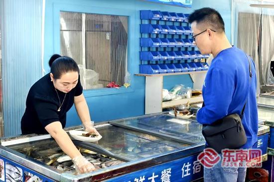 沈青梅为游客介绍新鲜海味 东南网漳州2月14日讯(本网记者 沈文栋 陈惠华 文/图)岁末新春将至,春运大潮涌动,众多游子踏上归乡旅途,全国多数旅游景点也随之步入传统淡季。但在漳州东山澳角村,浓郁年味裹挟着八方游客前来,让这个冬日里的渔村一扫淡季的冷清,处处暖意融融。 澳角村海港旁的海角城海上餐厅,临近午餐时间,餐厅里一下子就热闹起来了。“今天的海胆格外鲜活,您可以尝尝鲜,这条海鱼也是刚上岸的好货!”面对天南海北的食客,餐厅负责人沈青梅热情又细致地推介着当日新鲜海味。 她一边介绍着海鲜,一边熟练地给游客们核对订单,随着订单被送到后厨。不一会儿,一道饱含东山渔家风味的地道海鲜便被摆上了餐桌,引得食客大快朵颐。来自广东潮州的潘先生是店里的老熟客,时常携亲友驱车专程前来品尝海鲜。他笑着说,吃完这顿午饭便启程回潮州过年,临走前还要再采购一批澳角本地海鲜,为自家年夜饭添上几道地道硬菜。
