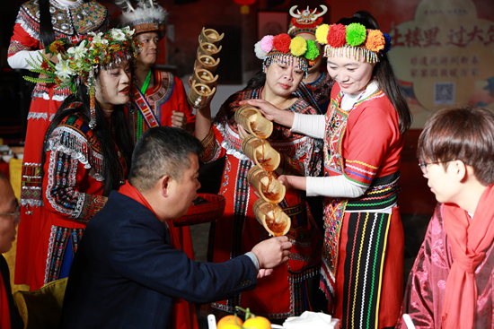 暮色中,身着民族服饰的少女挑着花篮,寓意花开富贵。福灯巡游队伍向游客缓缓走来,土楼姑娘将福球和糖果抛向人群,游客们争相接住,年味扑面而来。 走进二宜楼内,竹竿舞的清脆敲击声与欢笑声交织,游客们尽情加入其中,在节奏中感受新春的喜悦。广场另一侧,大家手拉手跳起拉手舞,围成大大小小的圆圈,寓意团圆美满。 土楼一角,高山族非遗“打陀螺”引来阵阵喝彩。表演者将陀螺抛向两米高、仅五公分宽的陀螺盘,引起阵阵欢呼。“走线陀螺”更是精彩,陀螺沿着细线飞速旋转,精准落入七米外的目标盘中,现场不断响起掌声。陀螺转得越快,寓意新年五谷丰登,寄托了人们对丰收的美好期盼。