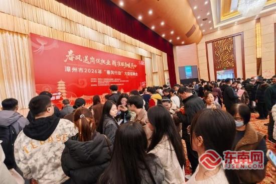 招聘会现场热闹非凡 东南网漳州2月27日讯(本网记者 陈惠华 文/图)2月 27日,漳州宾馆水仙楼二楼内暖意融融、人头攒动,咨询的人群络绎不绝,由漳州市人社局联合多部门主办的2026 年“春风行动”大型招聘会在此火热启幕。 本次招聘会以“春风送岗促就业 精准服务暖民心”为主题,抢抓节后用工黄金期,据统计,当天共吸引312家企业参会,提供优质岗位1334个,计划招聘人数9290人。现场共吸引求职者1.43万人次进场参与,累计收到个人简历5118份,初步达成就业意向2596人次,现场成功签约78人,为全市冲刺新春经济“开门红”提供了坚实的人力资源保障。