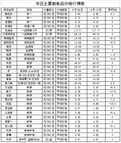 9月15日,监测漳州市31种主要农副产品价格,较上周(9月8日)比,9涨7降15平,其中,中秋节日效应逐渐显现,食品厂、糕点企业对蛋品的需求量增加,整体的蛋品价格上涨3.14%;猪肉市场需求端提振有限,整体的猪肉价格下降2.22%;部分蔬菜上市量有所增加,整体价格下降1.39%;受商超促销活动结束影响,监测的4种水产品价格小幅上涨5.57%。其它副食品价格稳定。(漳州市发改委)