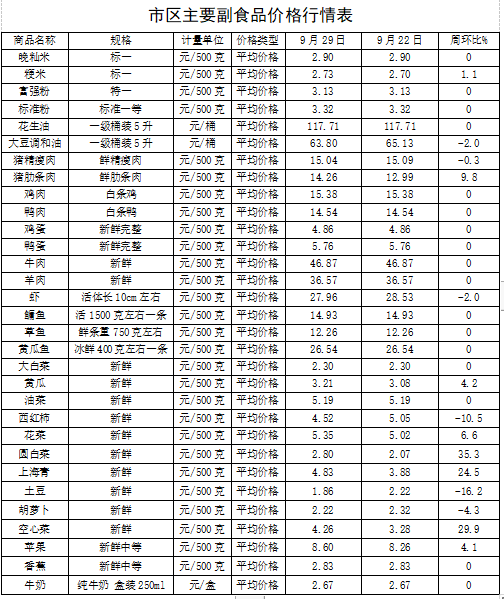 9月29日,监测漳州市31种主要农副产品价格,较上周(9月22日)比,8涨6降17平,其中,受台风过境影响,部分蔬菜产区,田间积水致叶菜、根茎类蔬菜受灾,短期上市量减少,运输流通成本增加,整体的蔬菜价格上涨6.19%;受节前备货需求影响,屠宰企业、下游经销商增加采购量,整体的猪肉价格上涨4.34%;今年苹果主产区遭遇多次自然灾害,苹果产量下降,带动整体的水果价格上涨3.06%。其它副食品价格稳定。(漳州市发改委)