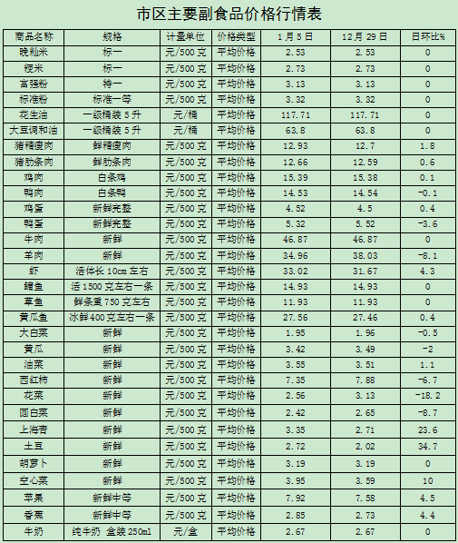 1月5日,监测漳州市31种主要农副产品价格,较上周(12月29日)比,12涨8降11平,其中,蔬菜价格涨跌互现,价格微涨0.97%;受元旦假期需求增加,猪肉走货速度加快,整体的猪肉价格小幅上涨1.19%;水果市场受元旦假期需求增加,价格小幅上涨4.46%;受商超促销活动影响,监测的2种畜肉、2种蛋品价格分别小幅下降3.62%、1.8%。其它副食品价格稳定。(漳州市发改委)