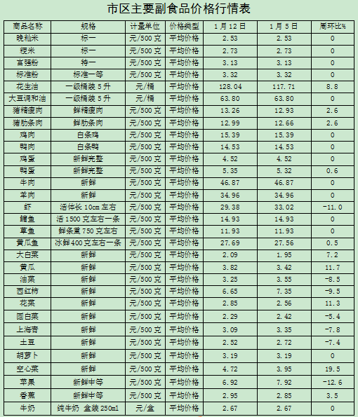 1月12日,监测漳州市31种主要农副产品价格,较上周(1月5日)比,10涨7降14平,其中,气温下降及腌腊需求带动猪肉市场消费需求略有回升,整体的猪肉价格小幅上涨2.58%;蔬菜类涨跌互现,供需平衡,整体价格微幅上涨0.03%;受春节前家庭备货,粮油需求增加,监测的2种粮油类价格上涨5.69%;受商超促销活动影响,监测的2种水果、4种水产品价格分别小幅下降8.36%、4.01%。其它副食品价格稳定。(漳州市发改委)