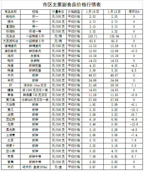 1月19日,监测漳州市31种主要农副产品价格,较上周(1月12日)比,9涨9降13平,其中,北方主产区大白菜、黄瓜等蔬菜进入集中上市期,供应增加,整体的蔬菜价格小幅下降1.25%;蛋品涨跌互现,价格微幅上涨0.51%;受商超促销活动结束影响,监测的2种水果、4种水产品价格分别小幅上涨6.79%、1.68%。其它副食品价格稳定。(漳州市发改委)