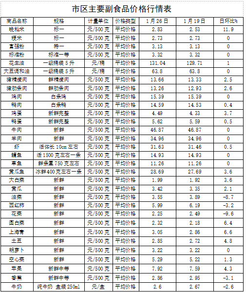 1月26日,监测漳州市31种主要农副产品价格,较上周(1月19日)比,16涨5降10平,其中,受生猪出栏价格上涨影响,整体的猪肉价格小幅上涨2.51%;随着春节备货周期启动,食品厂加大对蛋品的采购力度,整体的蛋品价格小幅上涨1.91%;蔬菜市场供需平稳,价格微降0.32%;受商超档期促销活动影响,监测的2种粮食价格小幅上涨5.7%。其它副食品价格稳定。(漳州市发改委)
