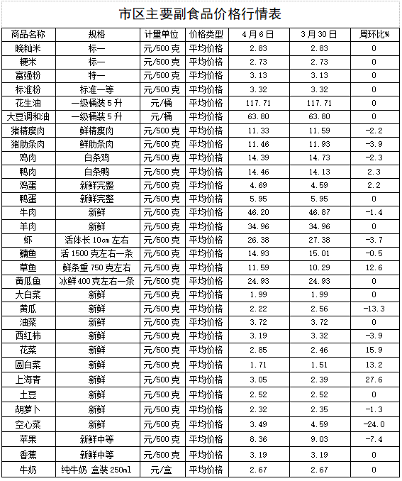 4月6日,监测漳州市31种主要农副产品价格,较上周(3月30日)比,6涨11降14平,其中,当前肉类处于消费淡季,居民采购需求偏弱,且猪肉市场供应充足,整体的猪肉价格小幅下降3.1%;本地露地蔬菜上市量增加,市场供应充裕,带动整体的蔬菜价格小幅下降1.28%受商超促销活动影响,监测的2种水果价格小幅下降6.48%。其它副食品价格稳定。(漳州发改委)