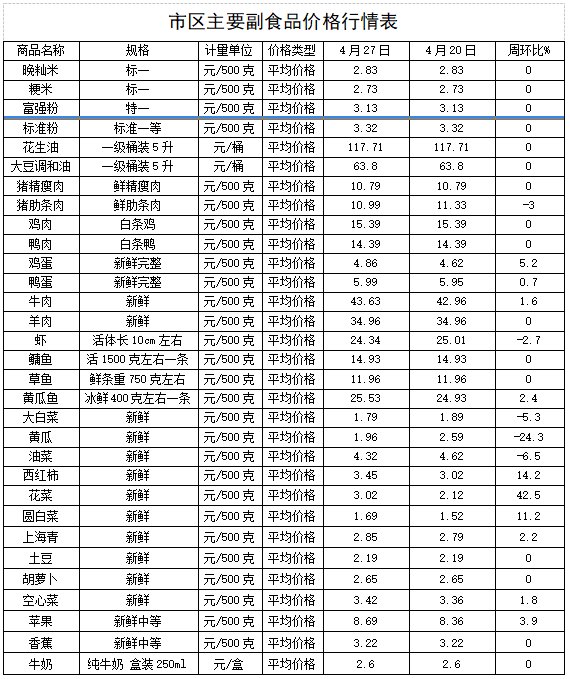 4月27日,监测漳州市31种主要农副产品价格,较上周(4月20日)比,10涨5降16平,其中,部分蔬菜陆续进入换茬期,上市量阶段性收缩,带动整体的蔬菜价格小幅上涨2.21%;蛋品经销商节前积极备货,提振下游市场,价格小幅上涨2.65%;猪肉市场仍处于供应宽松态势,价格小幅下降1.54%;其它副食品价格稳定。(漳州市发改委)